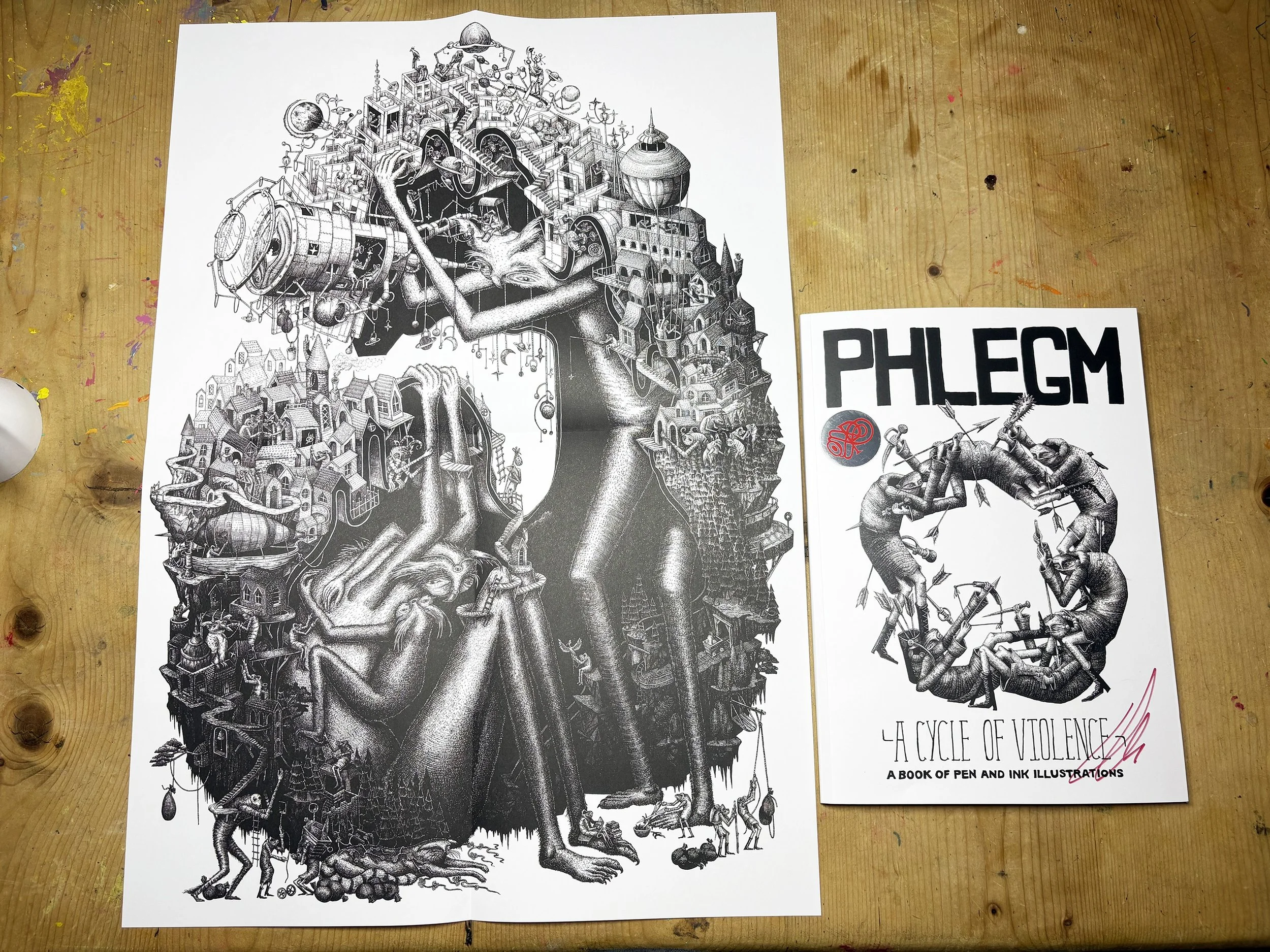 It was a great pleasure to collaborate on the layout and production of a new book with UK mural artist and printmaker Phlegm. All the drawings and etchings were professionally scanned to show every tiny detail printed at the same size as the original drawings. Once the artist had hand signed and stickered the books they went on sale this week and sold out instantly! Although some have been put aside for shop sales.